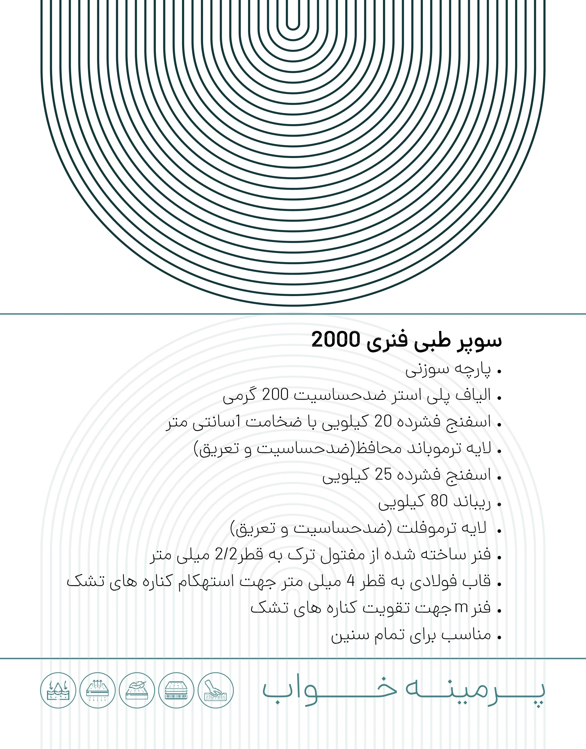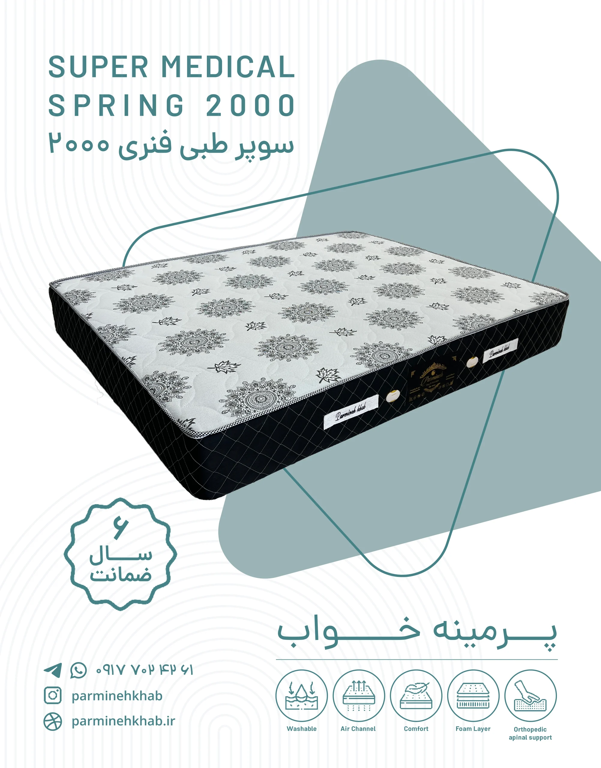 | ابعاد | تک نفره (استاندارد) 90*200*26, تک نفره (بزرگ) 120*200*26, دونفره (استاندارد) 160*200*26, دونفره (بزرگ) 180*200*26 |