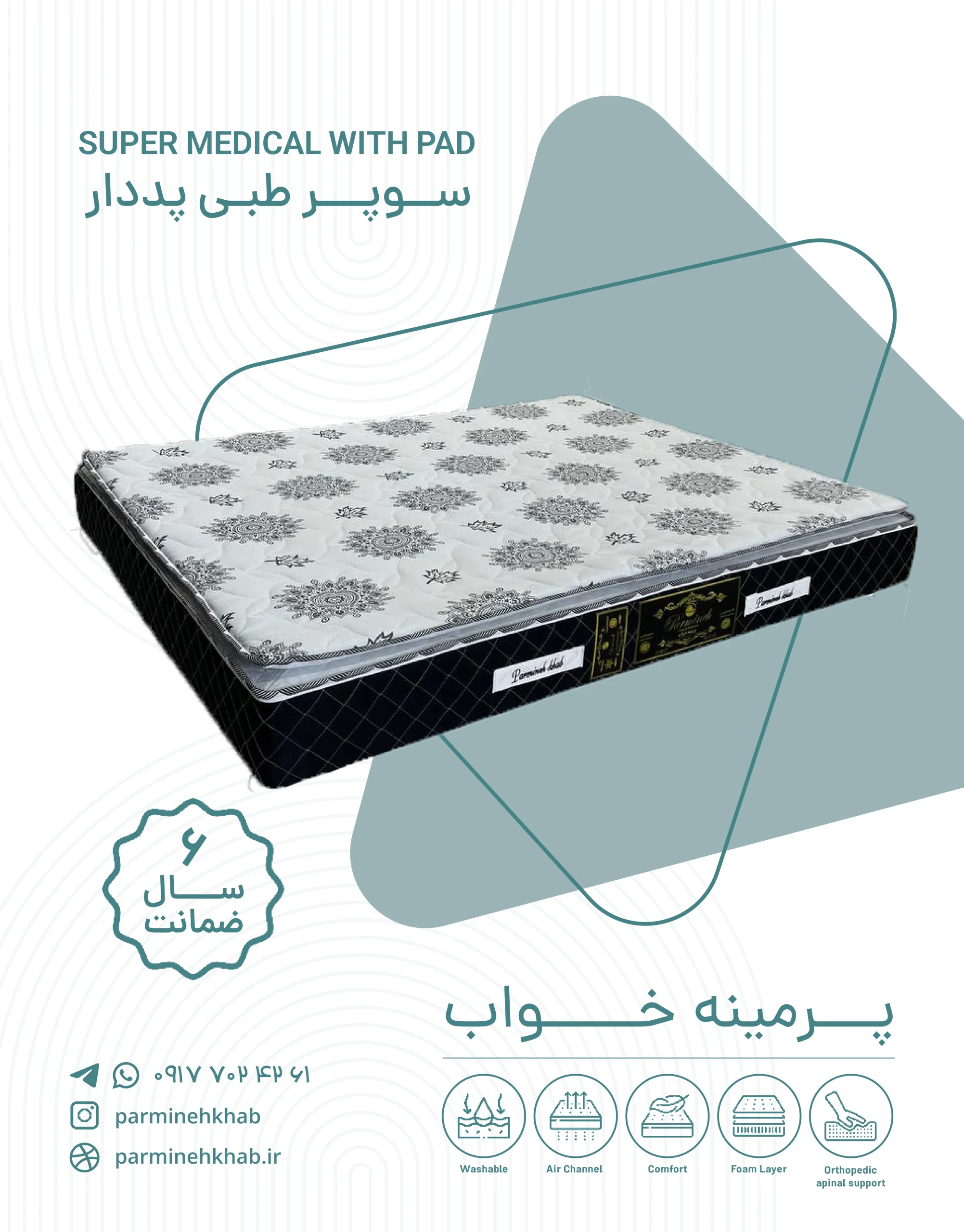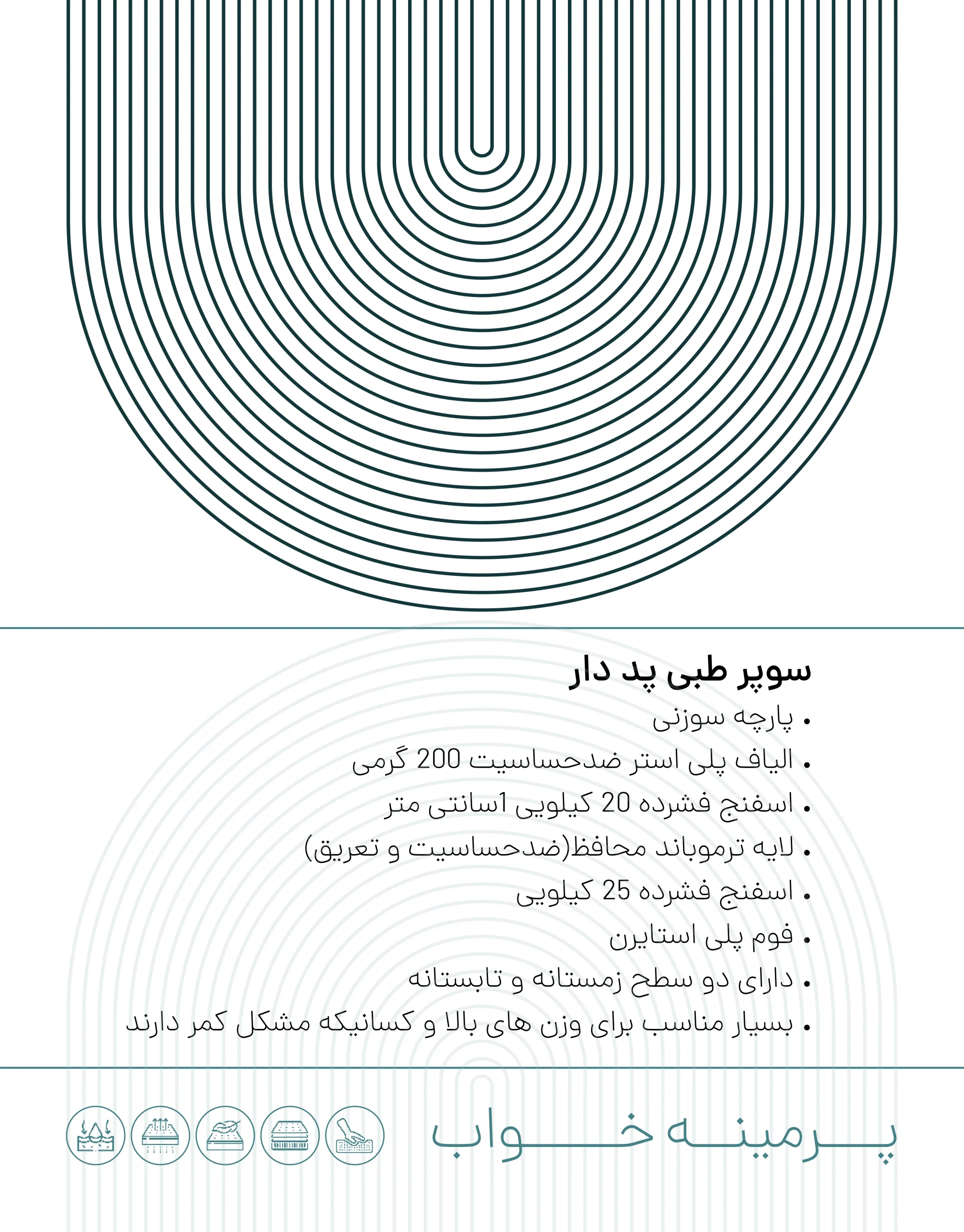 • ابعاد: تک نفره (استاندارد) 90*200*28, تک نفره (بزرگ) 120*200*28, دونفره (استاندارد) 160*200*28, دونفره (بزرگ) 180*200*28