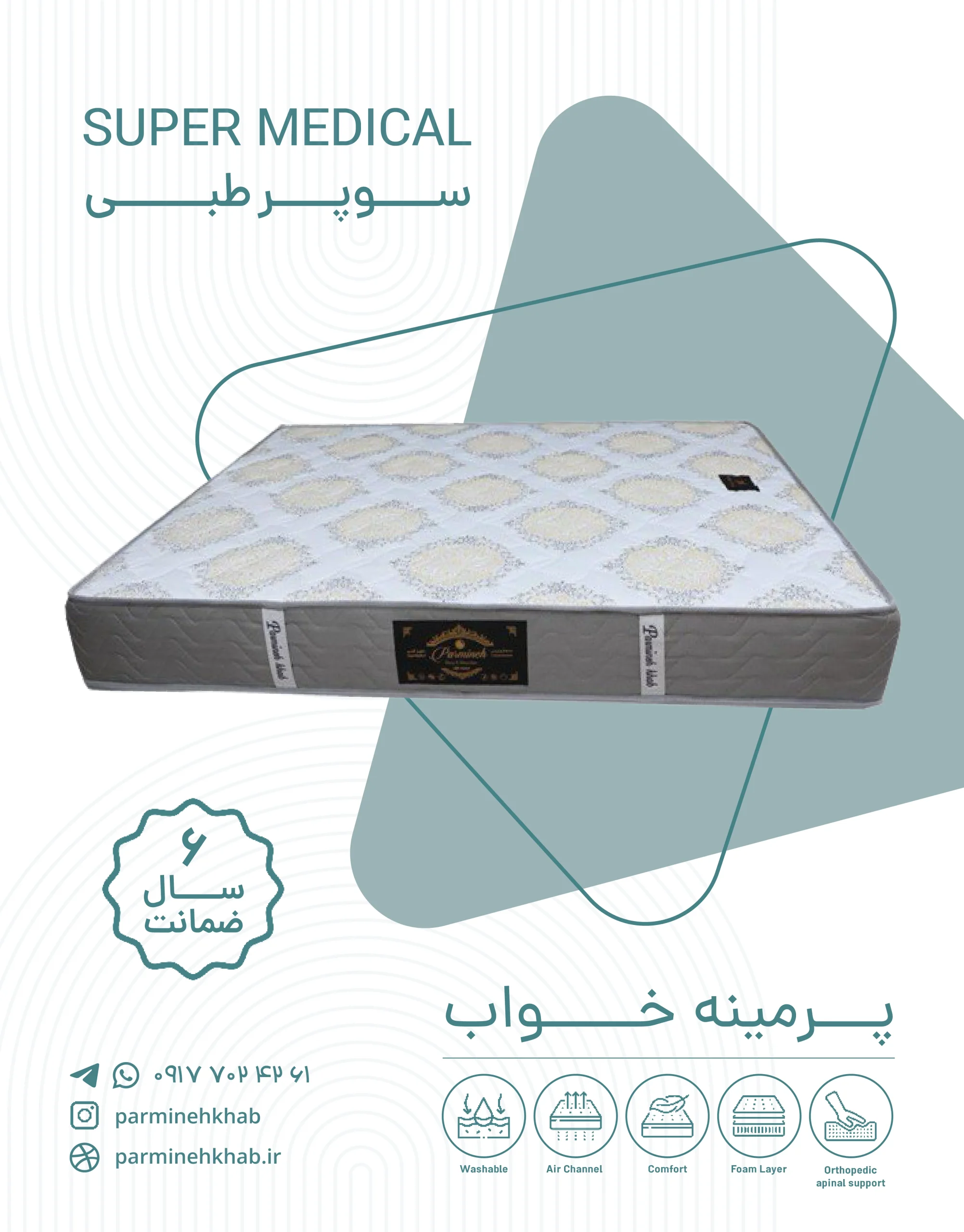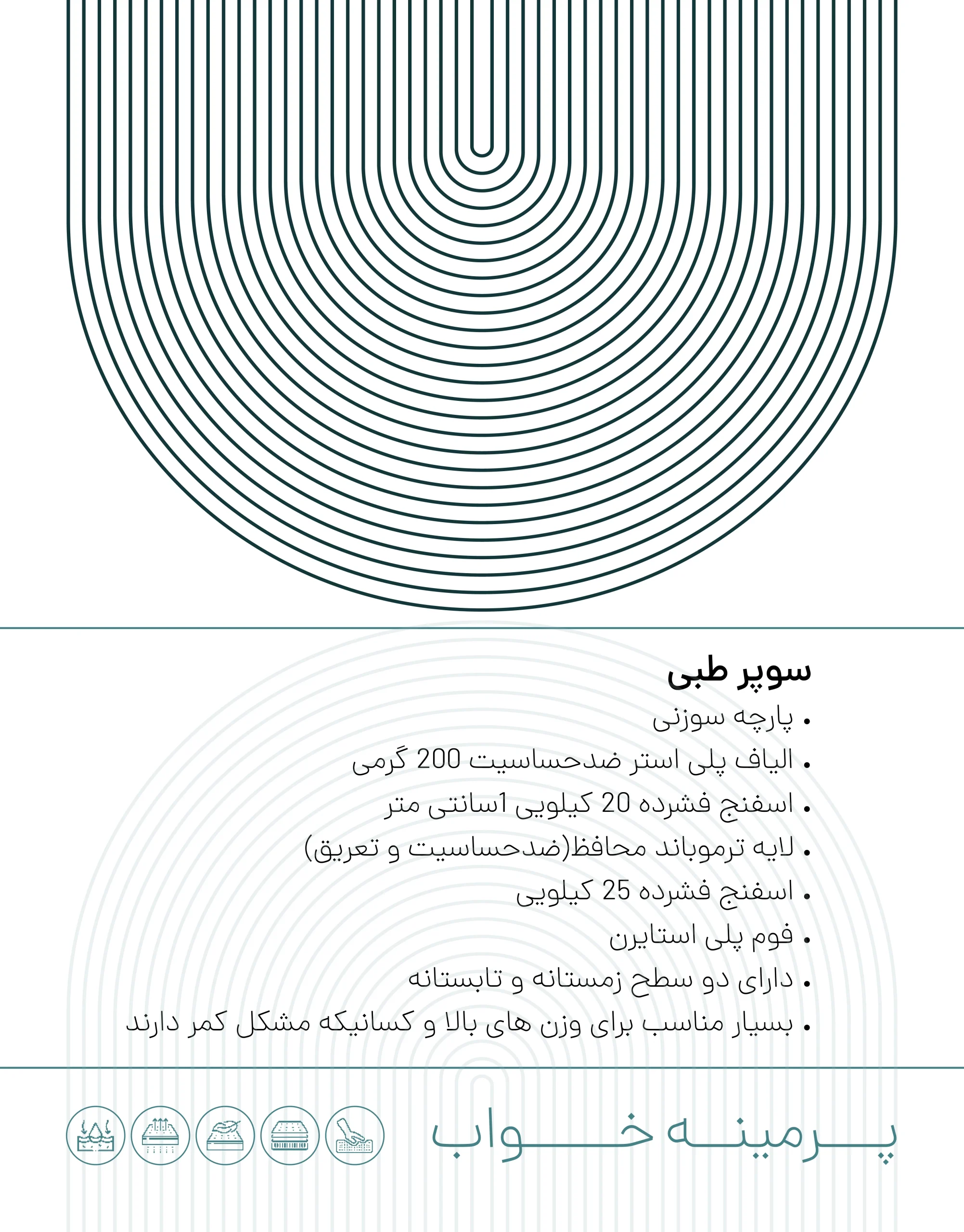 | ابعاد | نوجوان 80*180*22, تک نفره (استاندارد) 90*200*22, تک نفره (بزرگ) 120*200*22, دونفره (استاندارد) 160*200*22, دونفره (بزرگ) 180*200*22 |