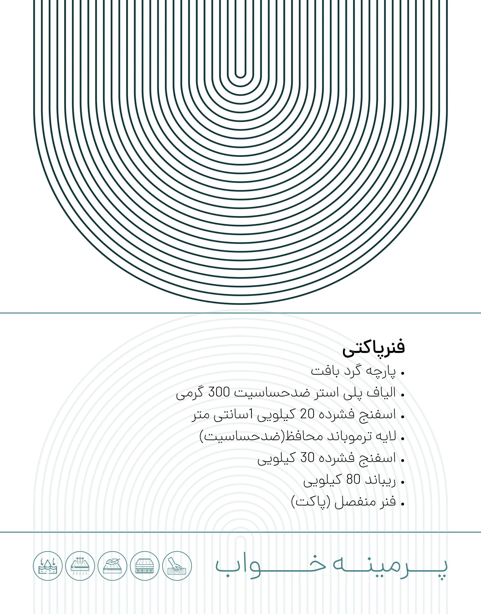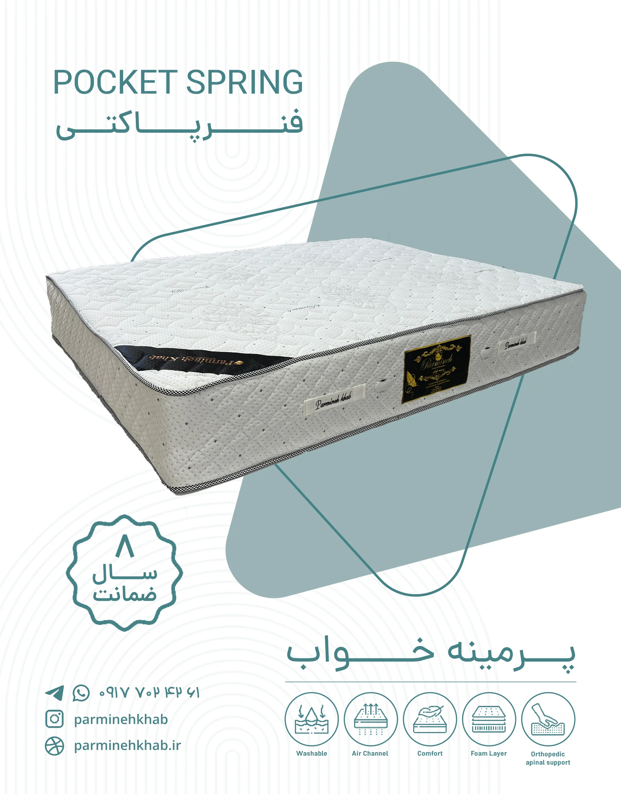 • ابعاد: تک نفره (استاندارد) 90*200*30, تک نفره (بزرگ) 120*200*30, دونفره (استاندارد) 160*200*30, دونفره (بزرگ) 180*200*30