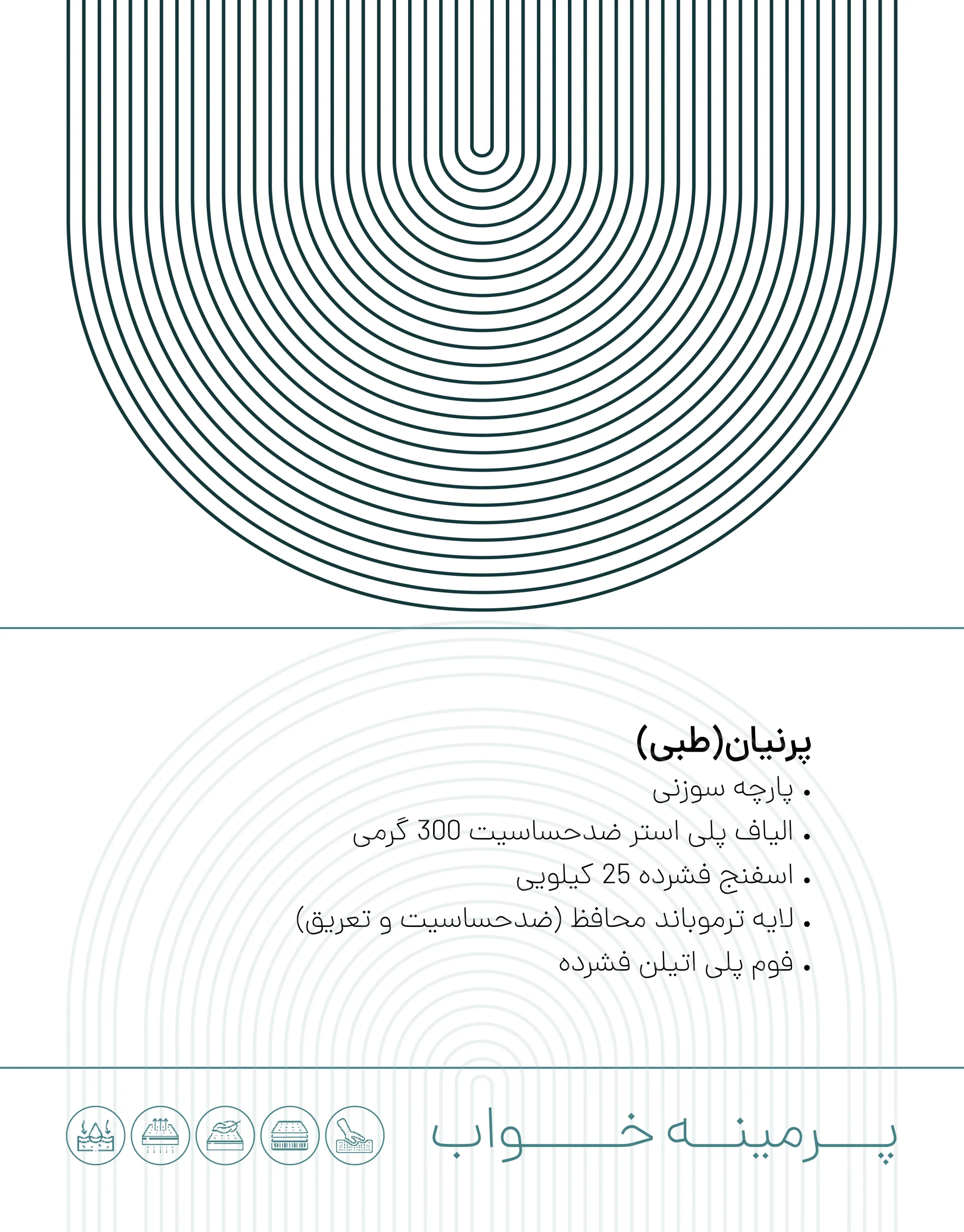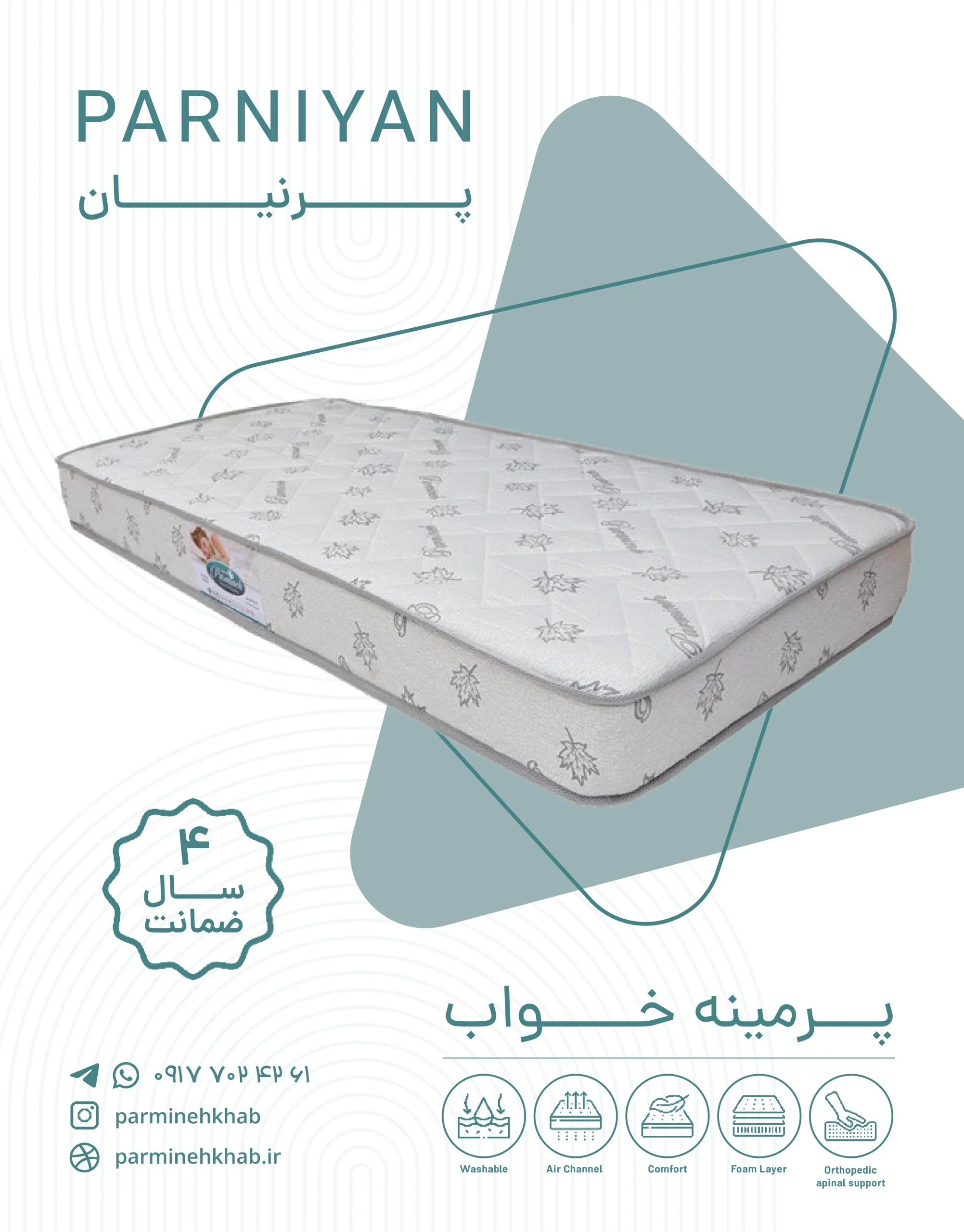 • ابعاد: نوجوان 80*180*20, تک نفره (استاندارد) 90*200*20, تک نفره (بزرگ) 120*200*20, دونفره (استاندارد) 160*200*20, دونفره (بزرگ) 180*200*20